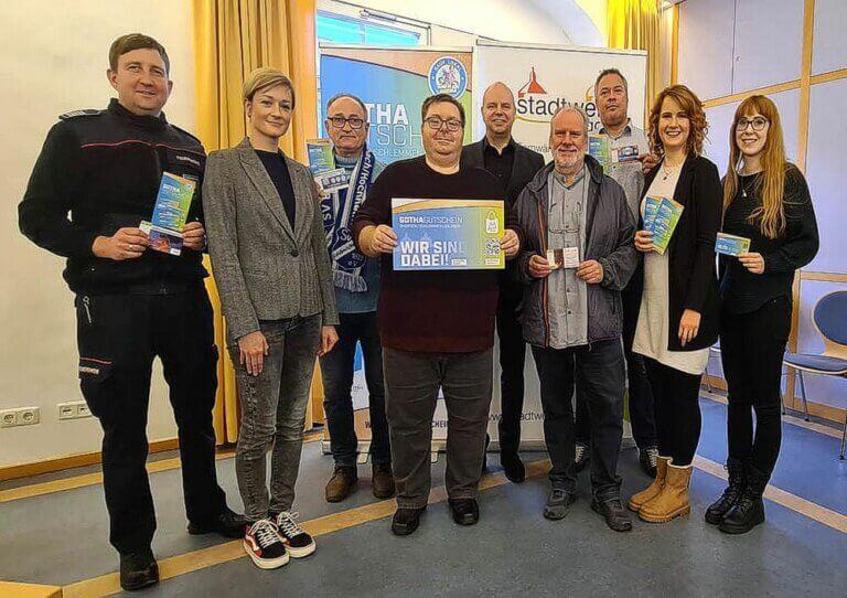 Ein besonderer Dank gilt den Stadtwerken Gotha, die die Initiative finanziell unterstützt und mit einer herausragenden Aktion auf ihren Social-Media-Kanälen begleitet haben. Durch ihre großzügige Unterstützung konnten vier engagierte Gothaer Vereine – SV Blau-Weiß 1893 Goldbach/Hochheim, Basketball in Gotha (BiG), Gotha glüht e. V. und der Stadtfeuerwehrverband Gotha e. V. – auf der Rückseite des Gutscheins 2024 für ihre Vereinsarbeit werben. Dies wurde durch die Stadtwerke Gotha GmbH ermöglicht, indem sie den Werbeplatz auf jeweils 10.000 Gutscheinen vergaben. Auch die VR Bank Westthüringen eG unterstützt bereits zum vierten Mal den Gotha Gutschein und trägt damit zur Umsetzung verschiedener Maßnahmen bei.
