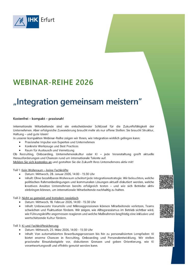 Webinar-Reihe “Integration gemeinsam meistern“ – IHK Erfurt (Enthält Anmeldelink, die einzelnen Webinare enthalten auch QR-Codes zur Anmeldung)